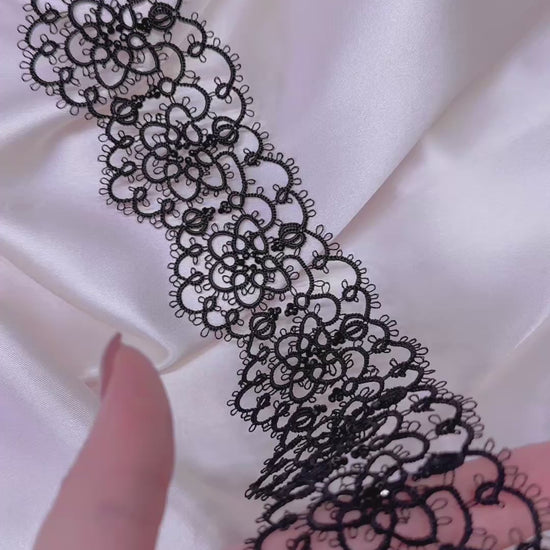 This elegant lace choker is handcrafted in the delicate art of shuttle tatting. Made with fine Mars 40 thread, the intricate floral lace is adorned with faceted black glass beads that shimmer with every movement.