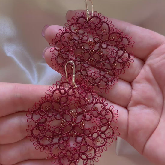 Delicately handcrafted in the art of frivolité (tatting lace), these elegant earrings feature a deep burgundy color and intricate lacework. Every loop is made with care using Ariana Vega 40 thread in shade Burgundy.