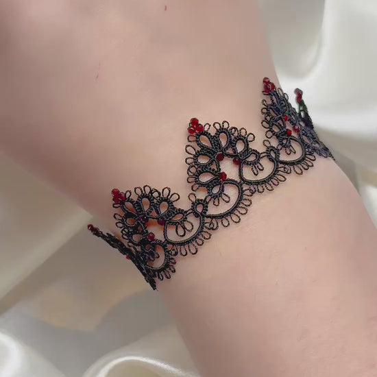 Dark Romance - Black Lace Bracelet with Red Beads and 925 Silver Clasp