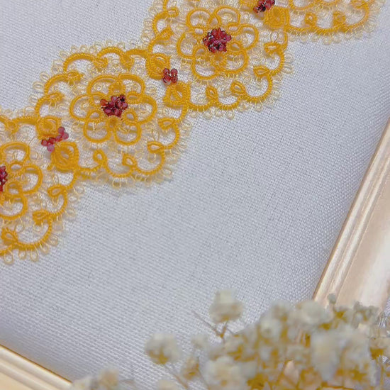 This romantic bracelet is handcrafted in the delicate art of tatting, forming blooming lace flowers in a sunny yellow shade. At the center of each flower sparkle natural red garnet beads, like tiny berries hidden in a summer garden.