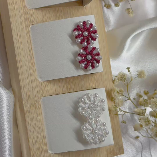 These elegant earrings are handcrafted with the tatting lace technique (frivolite). Shimmering Sanbest metallic threads and delicate glass pearls form a sophisticated floral design. The earrings are set on stainless steel stud bases, making them durable and hypoallergenic.