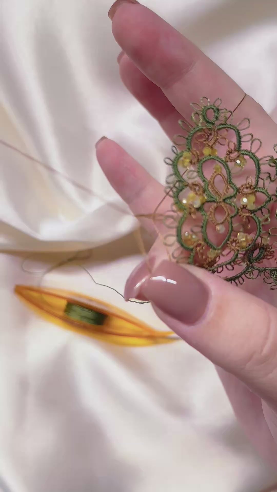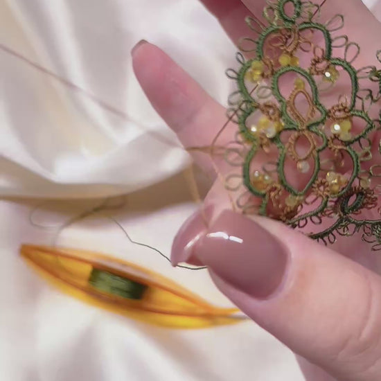 Experience refined elegance with this handcrafted beaded lace bracelet, created using the intricate tatting technique. Woven from Premium Italian Arianna Vega polyester threads in deep forest green and antique bronze, each lace motif is adorned with natural green garnet beads, adding a subtle gemstone sparkle.
